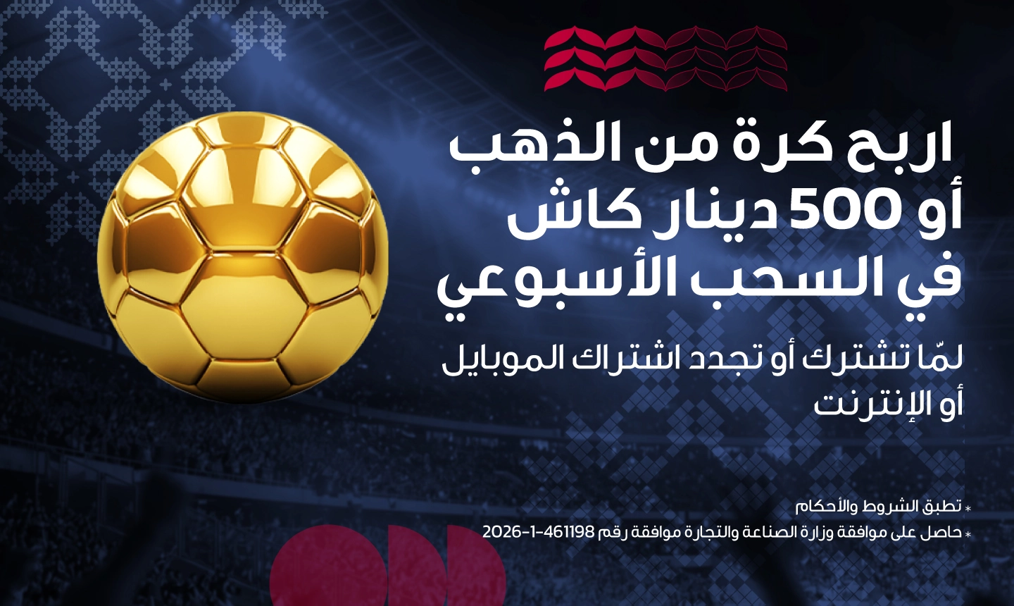 اشترك أو جدد اشتراك الموبايل أو الانترنت لفرصة ربح احدى الجوائز الاسبوعية القيمة.