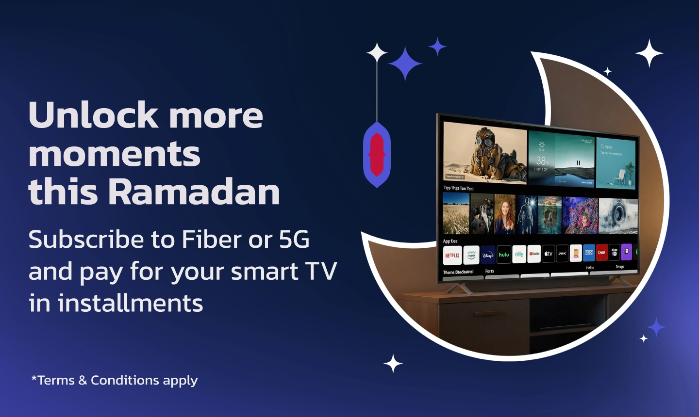 Unlock more moments this Ramadan, Subscribe to Fiber or 5G and pay for your smart TV in installments.